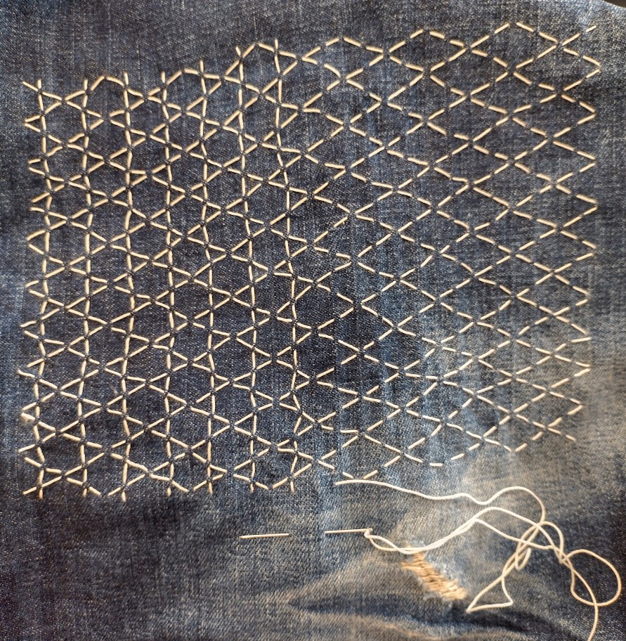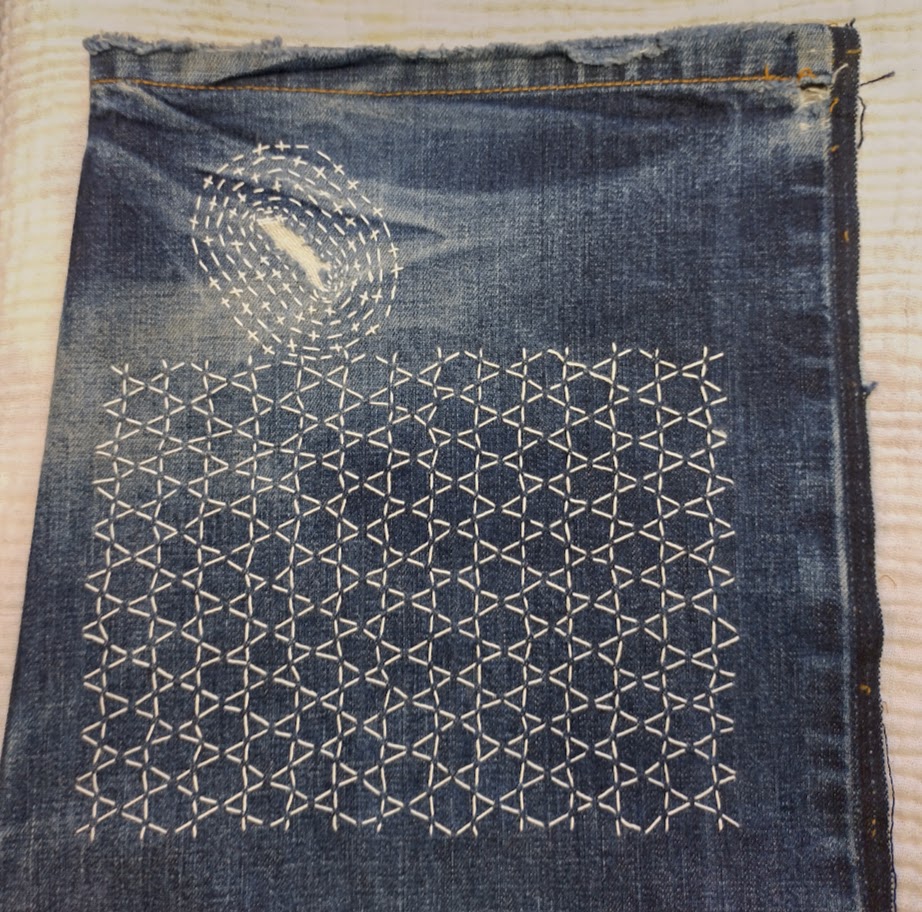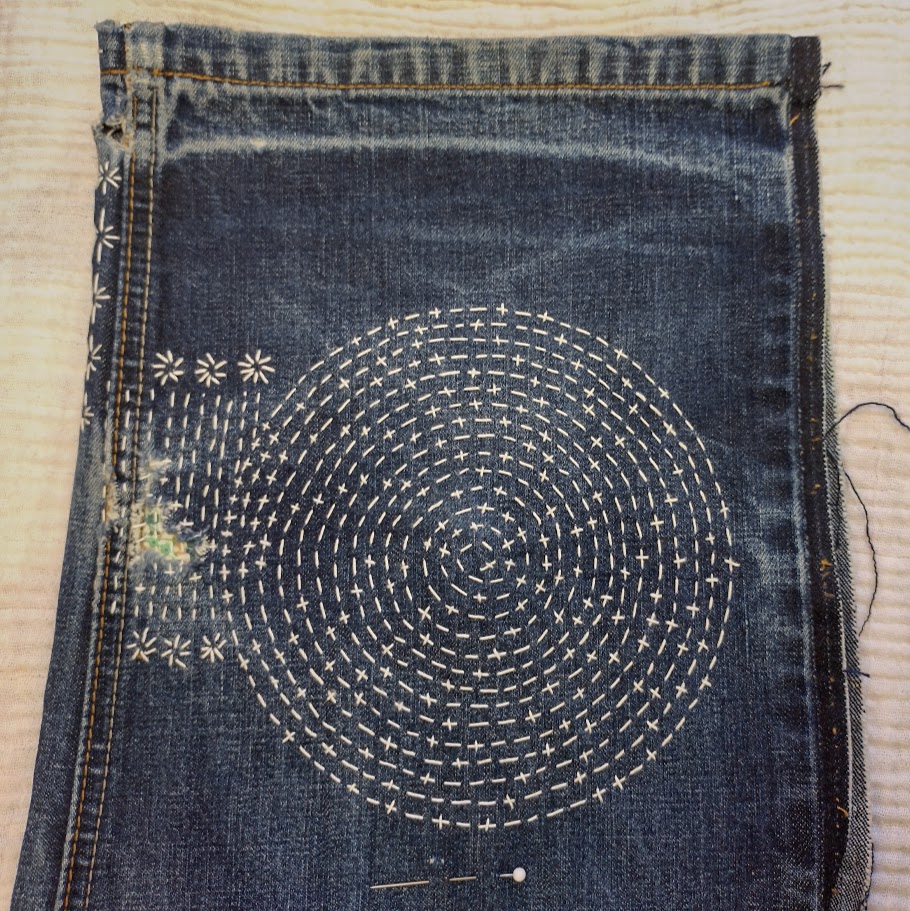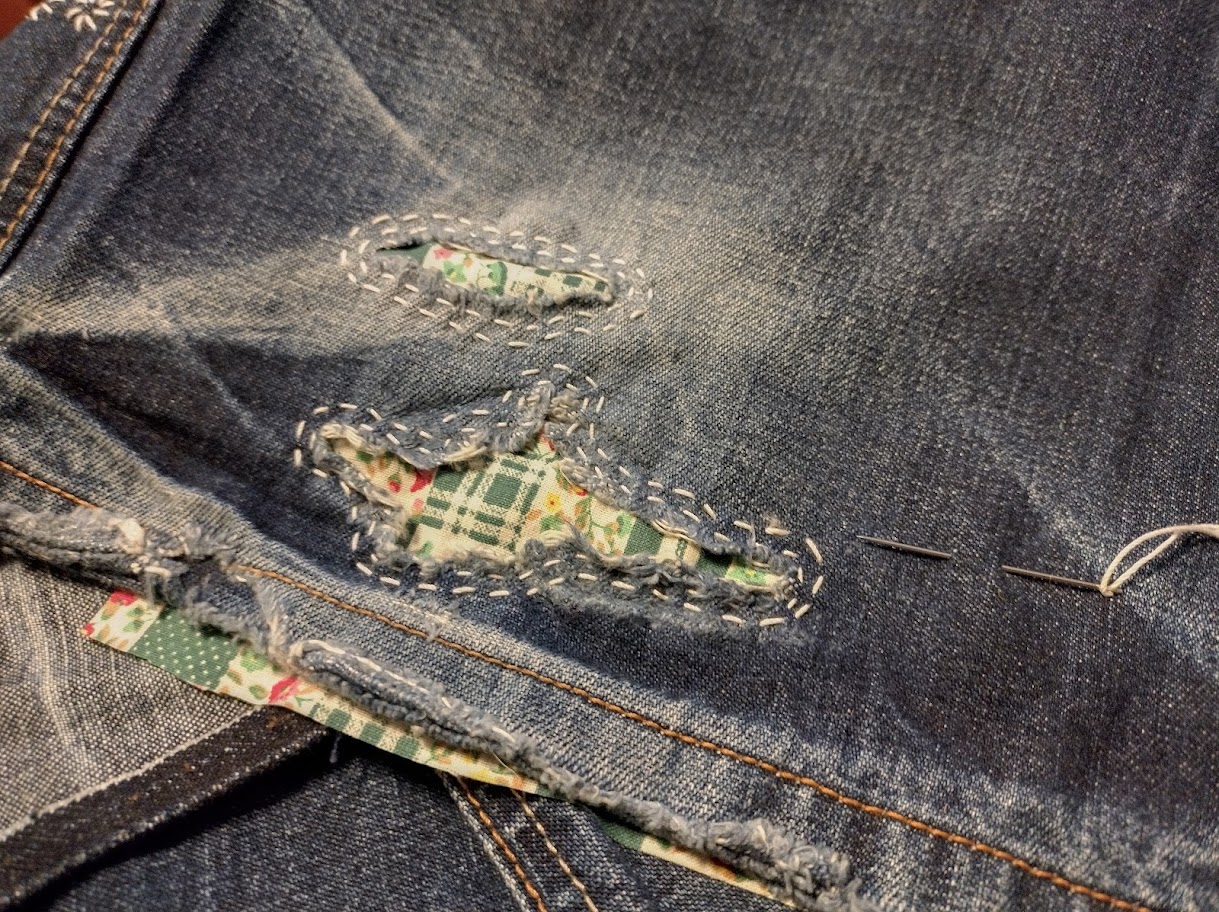Ensin avasin lahkeiden sivusaumat, jonka jälkeen oli sujuvaa kirjoa kaikkiin kylkiin sashikot, sekä myös paikata boropaikkauksella reiät ja lahkeensuut kuntoon.