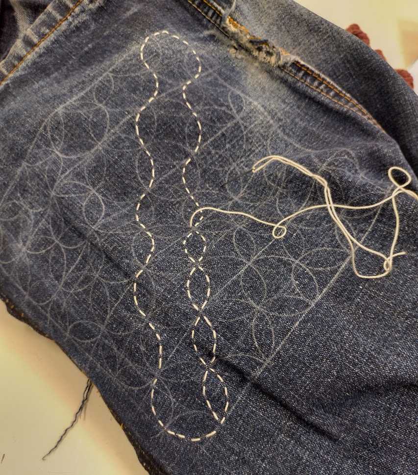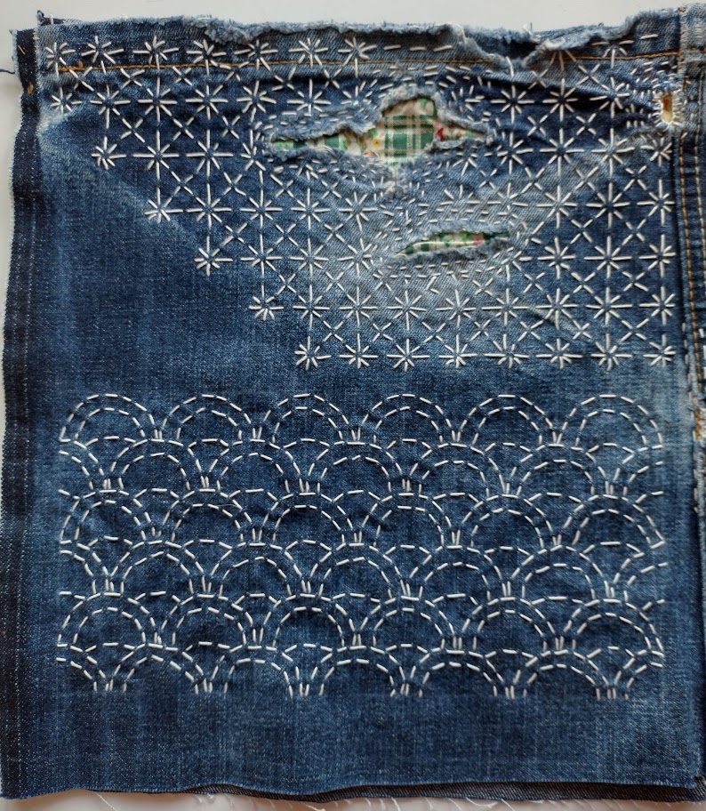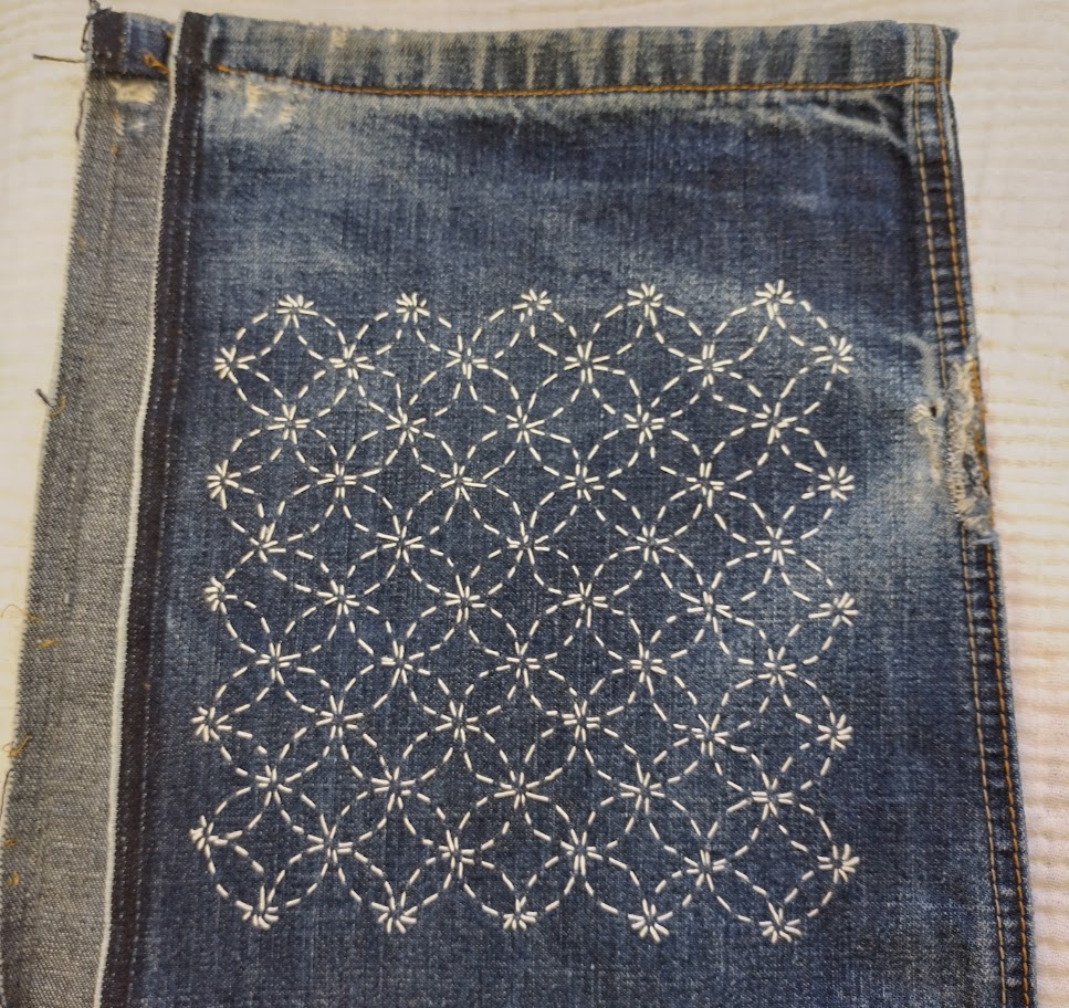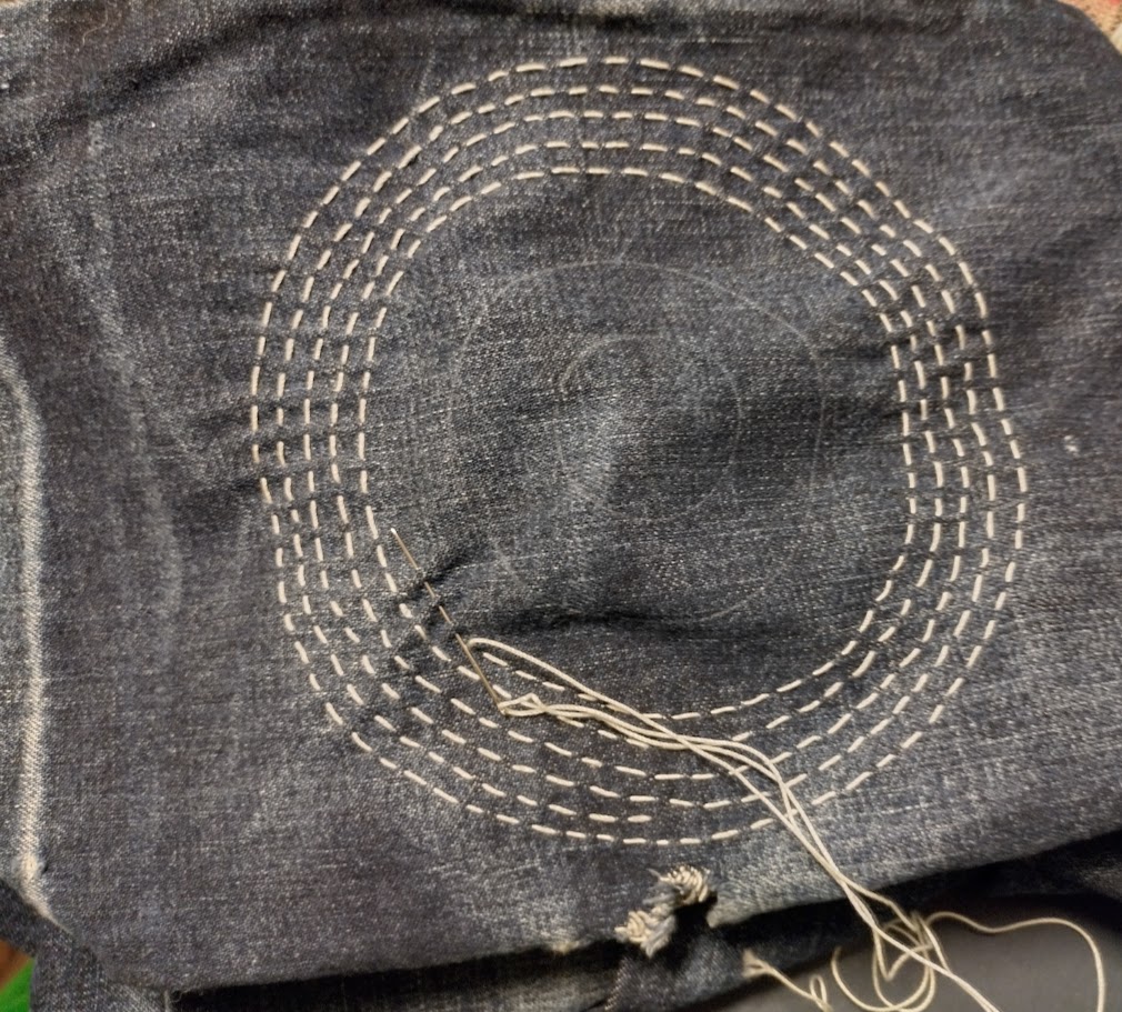 Ensin avasin lahkeiden sivusaumat, jonka jälkeen oli sujuvaa kirjoa kaikkiin kylkiin sashikot, sekä myös paikata boropaikkauksella reiät ja lahkeensuut kuntoon.