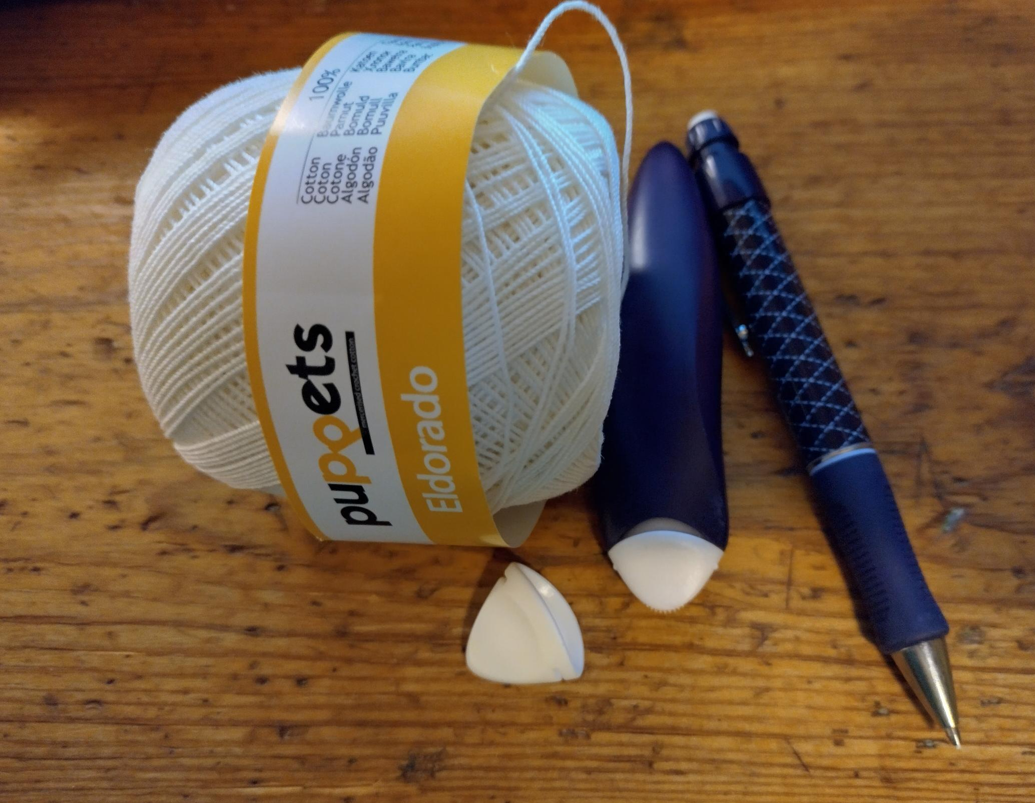 Farkkukankaan lisäksi tarvitaan tiivistä sileää puuvillalankaa, teräväkärkinen neula, sormustin sekä kuvioiden merkitsemiseen kaavaliitu tai merkitsemiskynä. Puuvillalanka löytyi kotoa, unkarilaista 100% puuvillaa, mutta merkitsemiseen hankin parikin uutta välinettä kurssilta; kynän ja merkitsemisrullan.