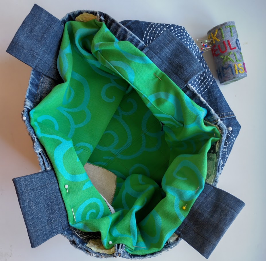 Tein farkkusaumasta avainta varten hihnan ja kiinnitin sen sopivaan kohtaan kassin yläreunaan. Sitten ompelin vuorin kiinni kassiin.