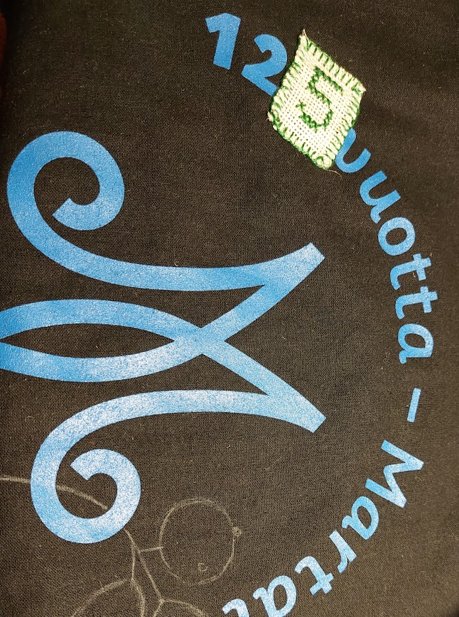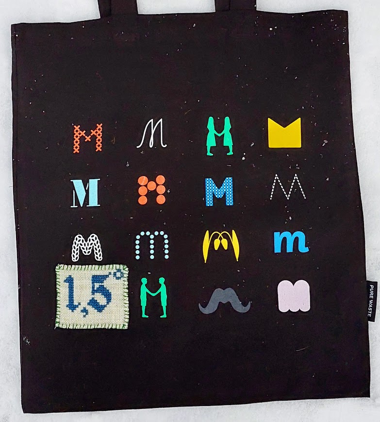 Kirjoin kassin päivitystä varten palttinakankaalle ristipistoin 0:n tilalle 5:n kassin vuosilukuihin. Ompelin ne paikoilleen. Kassin toiselle puolelle erilaisten M-kirjainten joukkoon liitin 1,5 astetta kirjonnan muistuttamaan ilmastotavoitteista. Se peittää alleen pienen 120-v marttalogon.