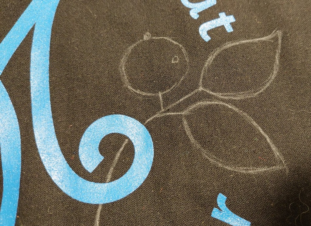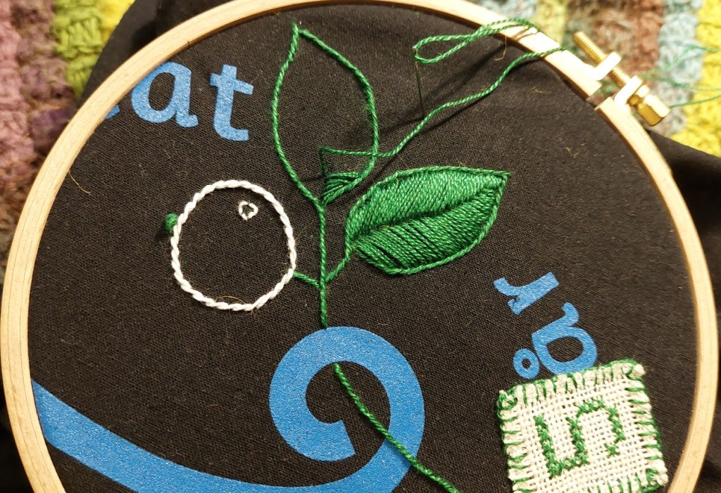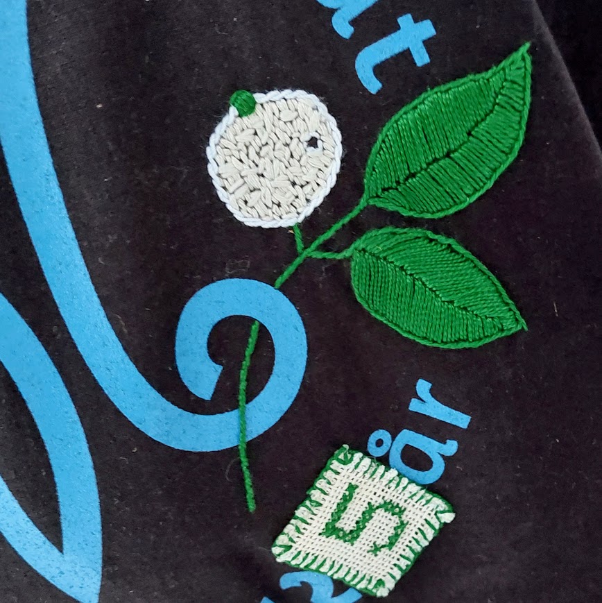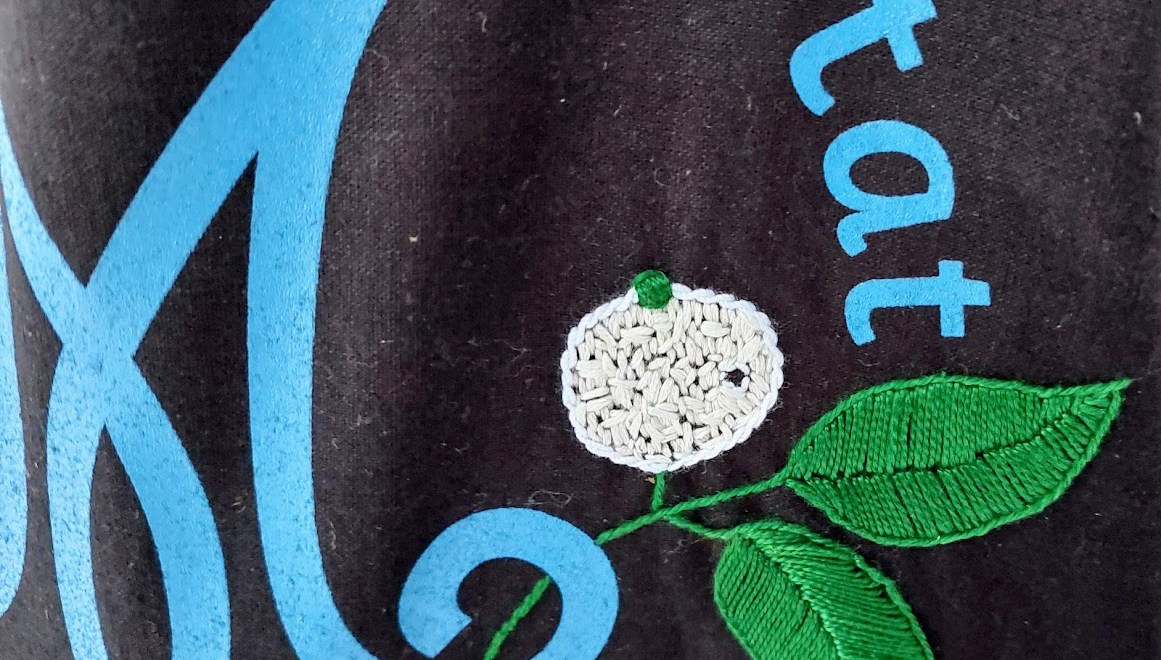 Kirjoin varvun varren ja lehtien ääriviivat vihreällä helmilangalla varsipistoilla. Samoin marjan ääriviivat kirjoin varsipistoilla, lankana sashikokirjonnassa käyttämäni puuvillalanka. Täytin lehdet helmilangalla laakapistoilla vihreiksi siten, että keskelle jäi lehtiranka.