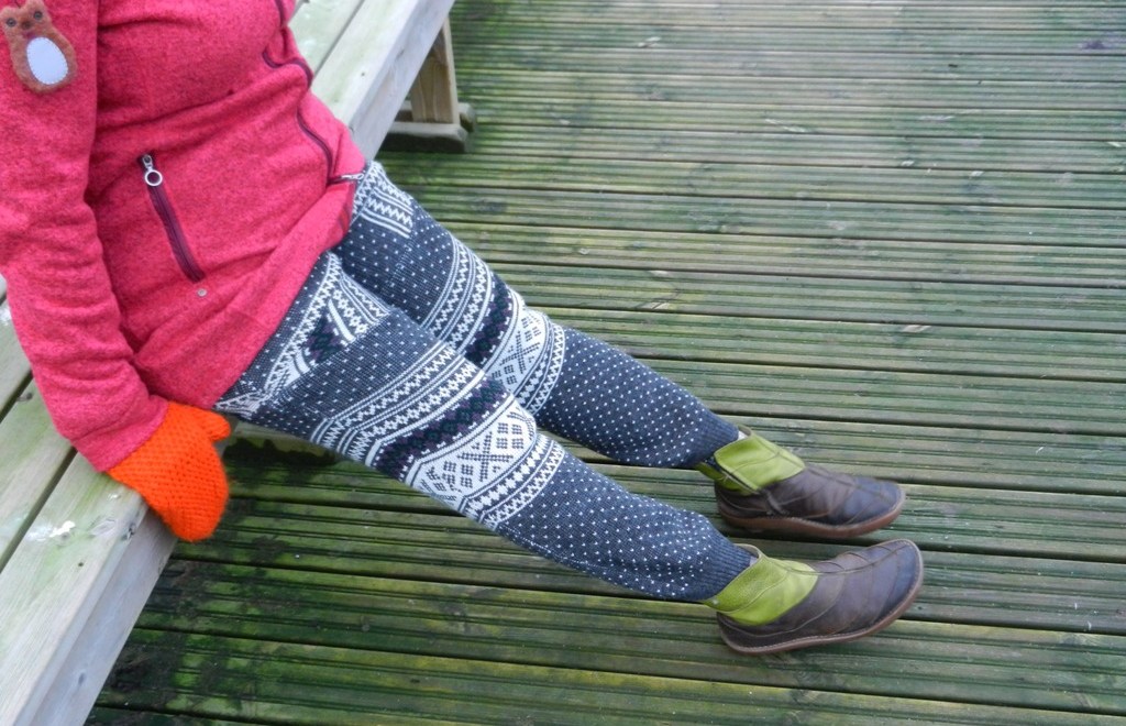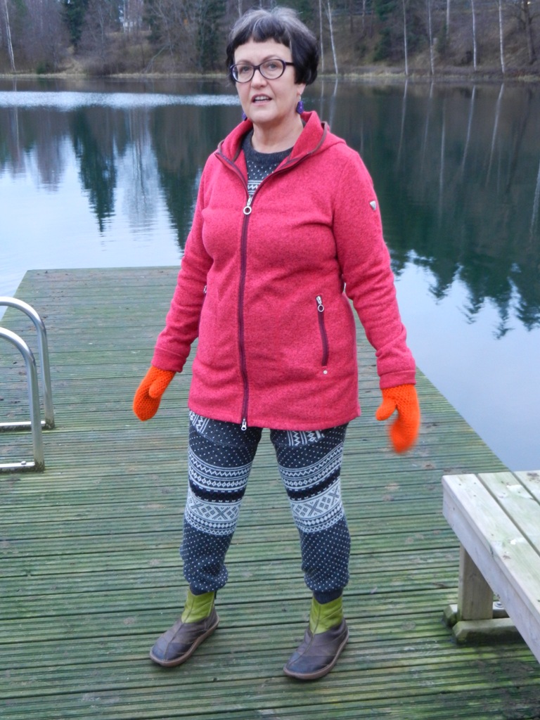 Kirjoneuleswantsini kuvattuna ensimmäisellä käyttökerralla 1.1.2014, jolloin ei todellakaan ollut lunta saati pakkasta. Huomaa myös kaula-aukosta näkyvä kauluri alkuperäisestä villapuserosta.