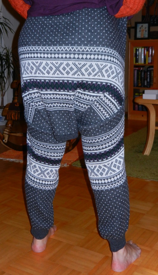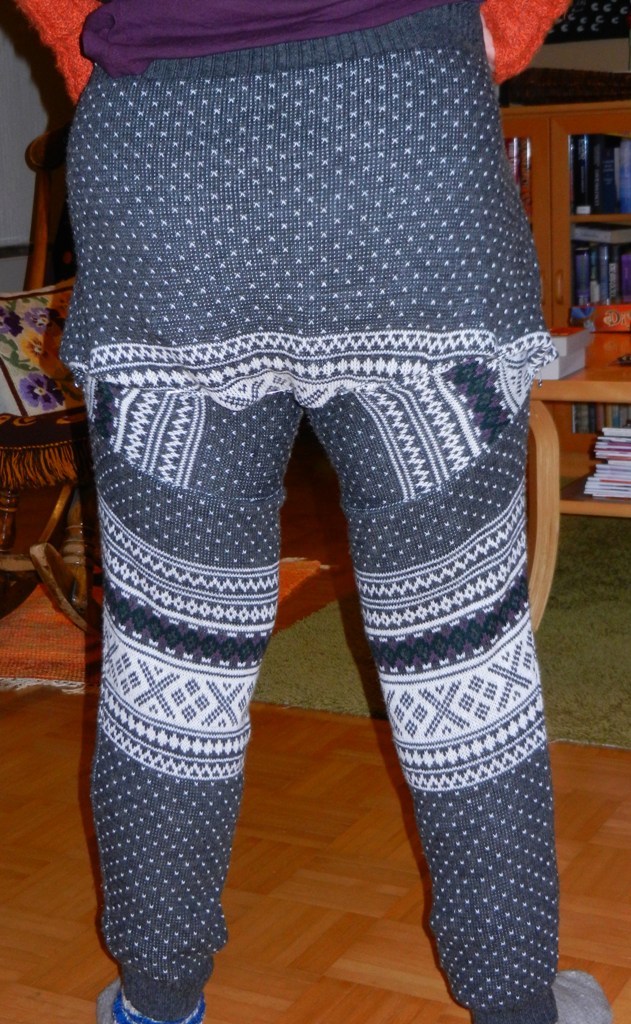 Swantsit ovat villapaidasta ommellut villahousut. Tein kahdet swantsit tasan 10 vuotta sitten ja hyvälaatuisina neuleina ne ovat edelleen molemmat käytössä. Kirjoitin aiheesta silloiseen blogiini punos-sidos-silmukka, joka löytyy edelleen verkosta. Raidalliset swantsit ovat ohuemmat ja menevät hyvin hameiden kanssa. Raidoista tuli varsin psykedeeliset kuviot, kun paita on muokattu istuviksi pöksyiksi. Kirjoneule swantsit ovat paksummat ja mitä mainioimmat pakkaskelin housut ohuiden villahousujen päällä.