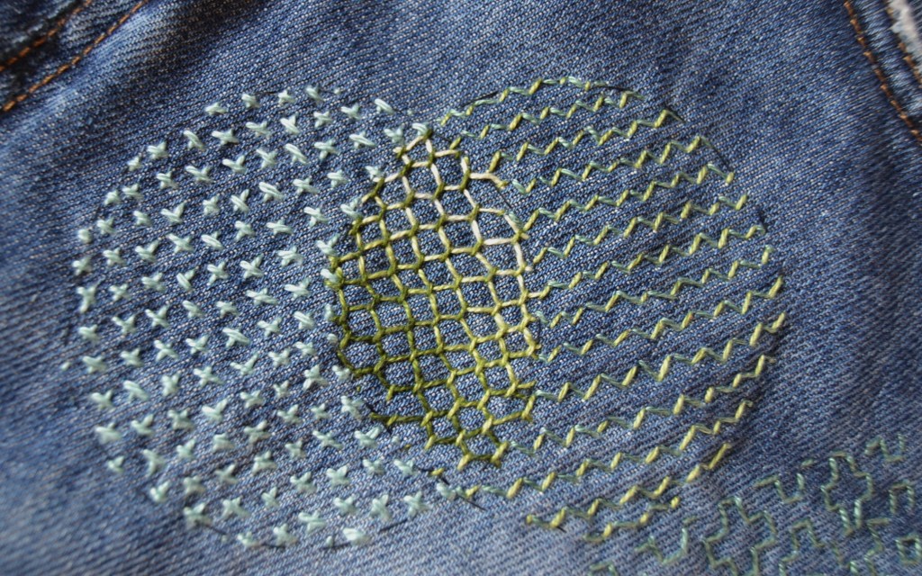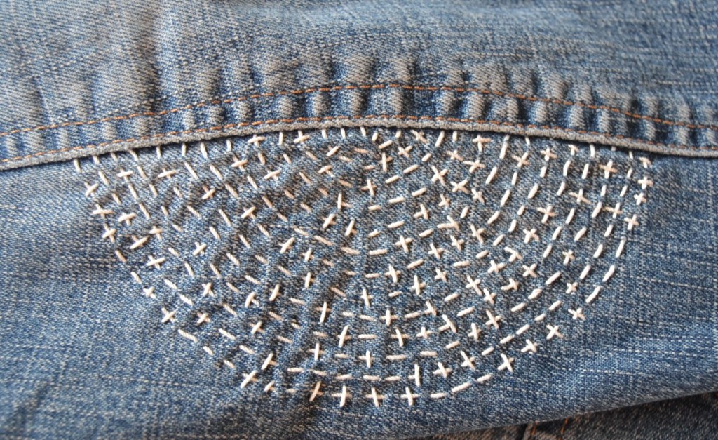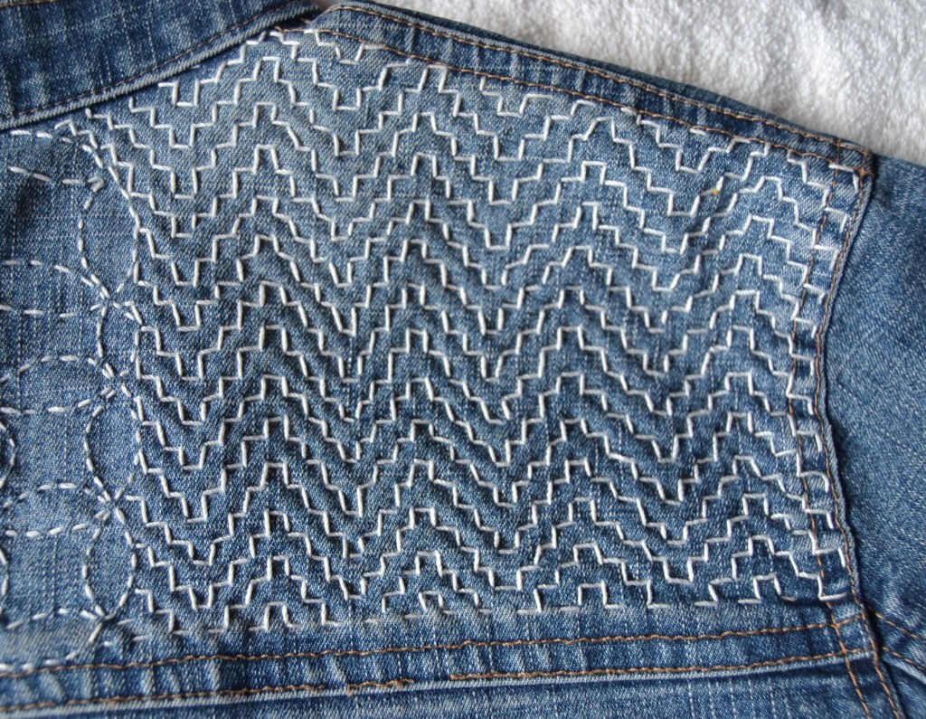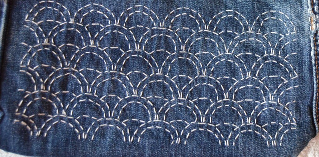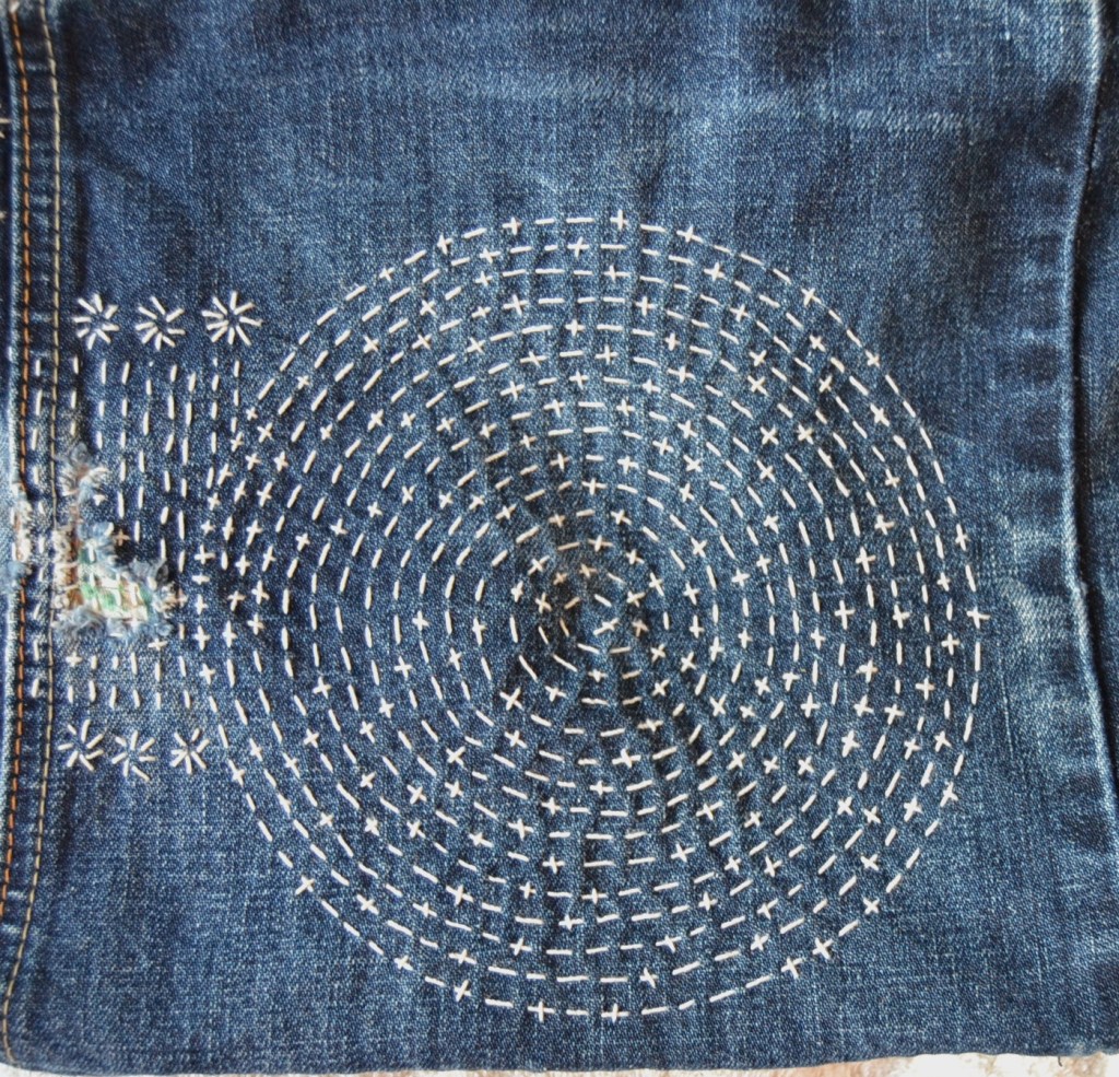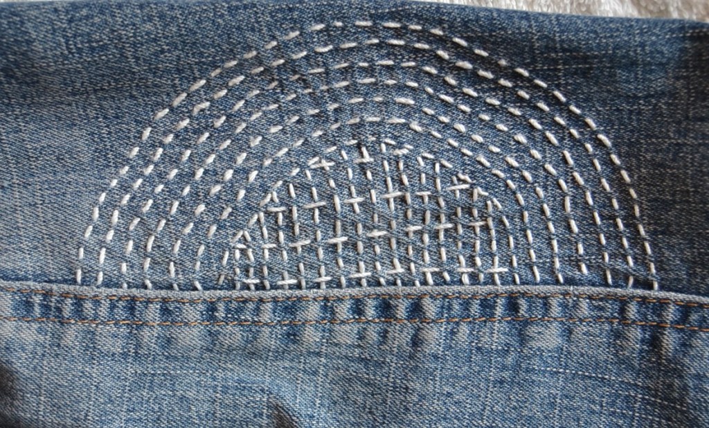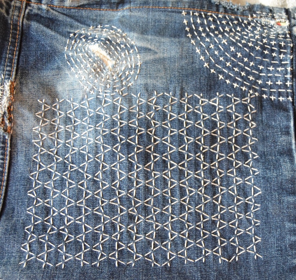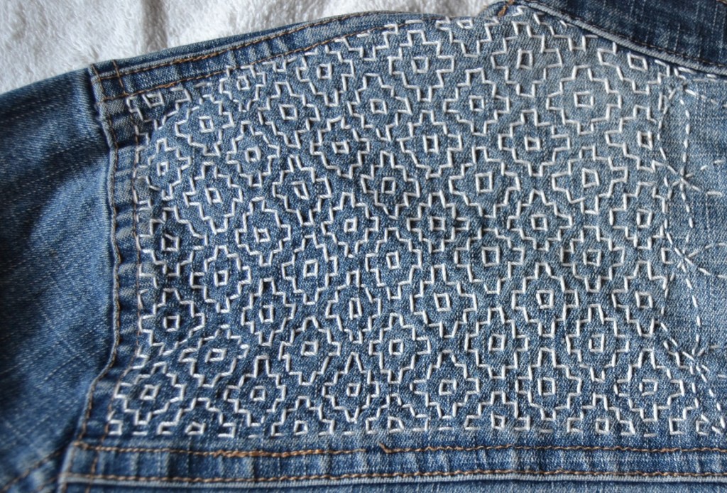 Olen nyt aloittanut pistelyssäni uuden vaiheen käyttämällä erilaisia pistelyitä erilaisiin kuviomuotoihin. Toistaiseksi kuvioni ovat olleet pääosin ympyräitä tai vinoneliöitä, mutta kohta on työnalla farkkujen toiseen pakaraan sydämenmuotoon jotain Sashiko-kuviota.