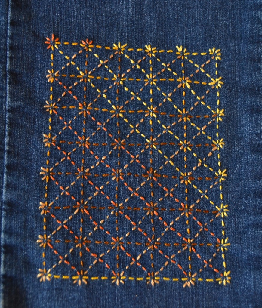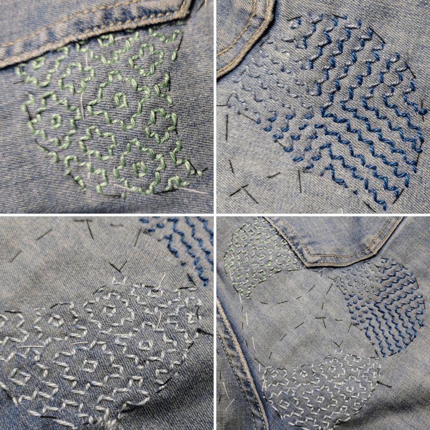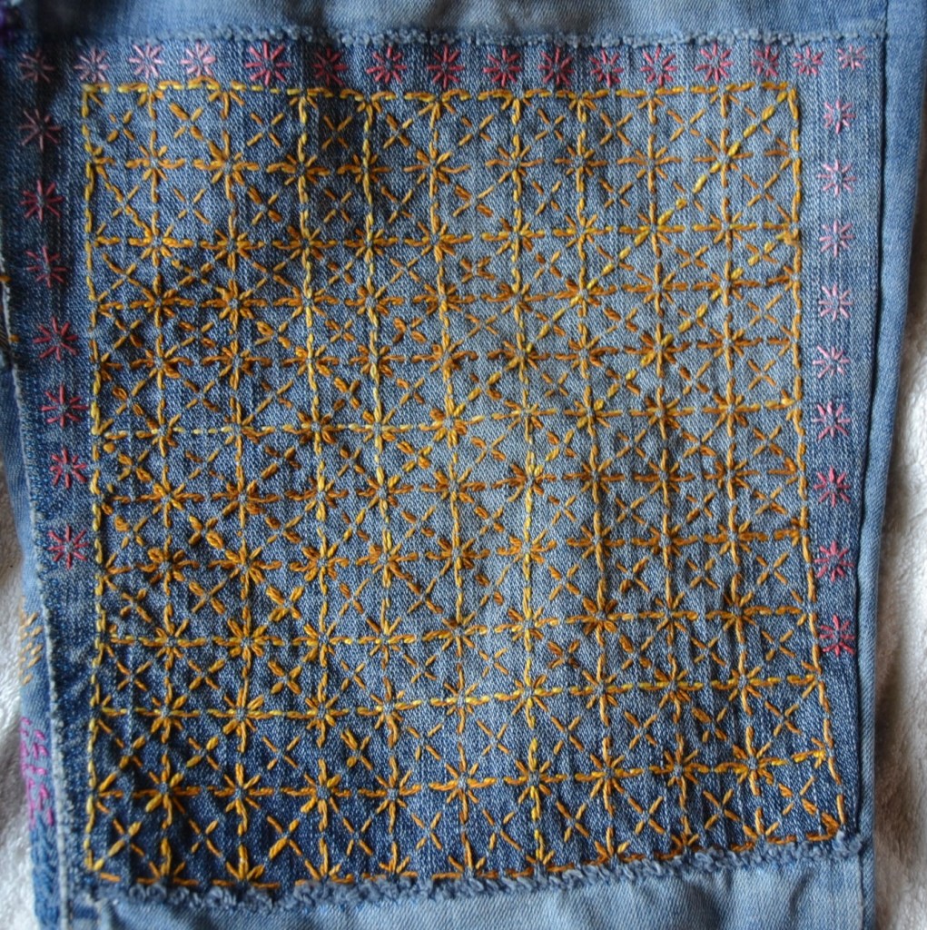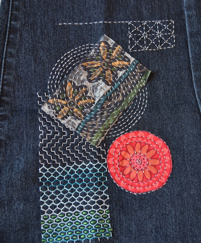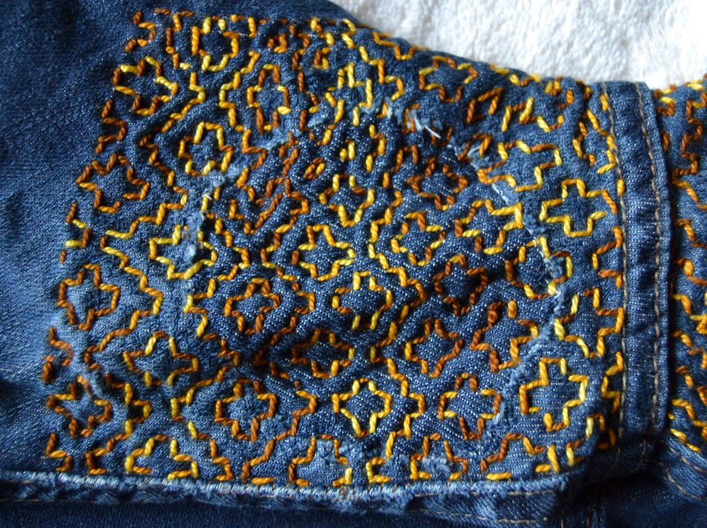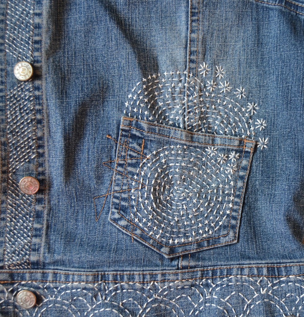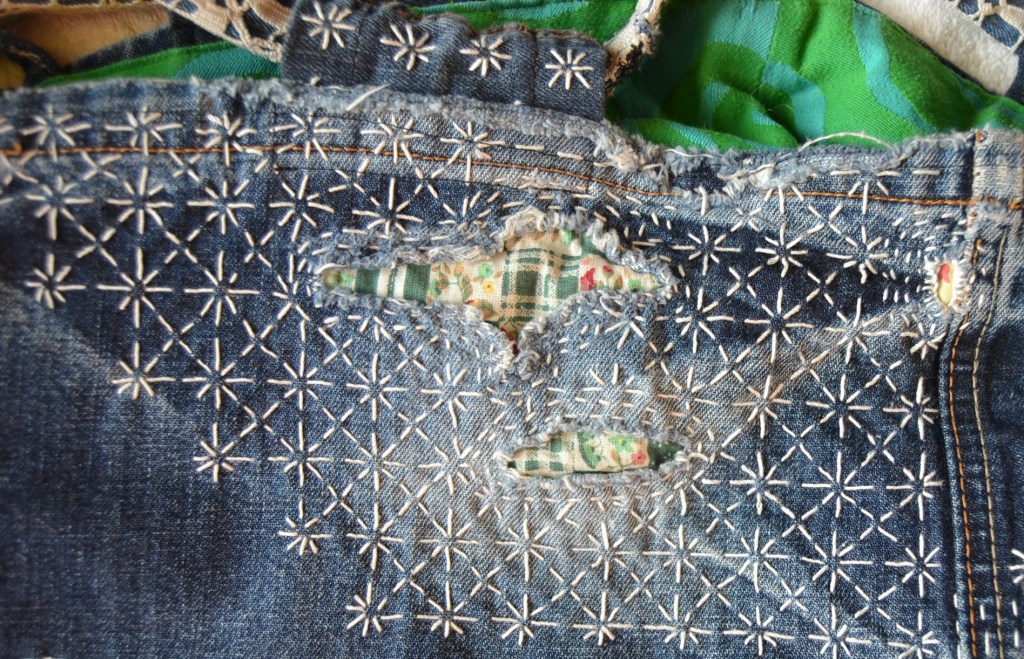 Olen nyt aloittanut pistelyssäni uuden vaiheen käyttämällä erilaisia pistelyitä erilaisiin kuviomuotoihin. Toistaiseksi kuvioni ovat olleet pääosin ympyräitä tai vinoneliöitä, mutta kohta on työnalla farkkujen toiseen pakaraan sydämenmuotoon jotain Sashiko-kuviota.