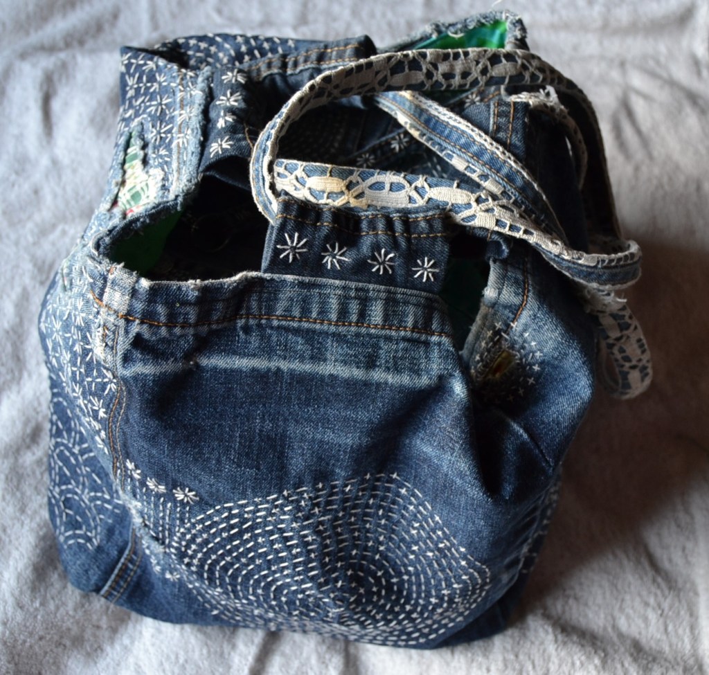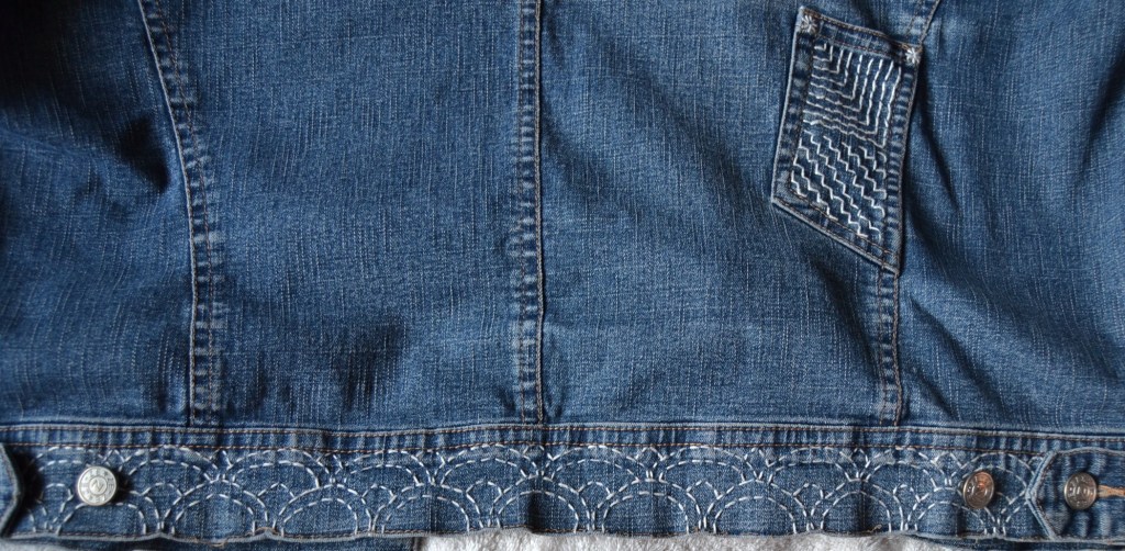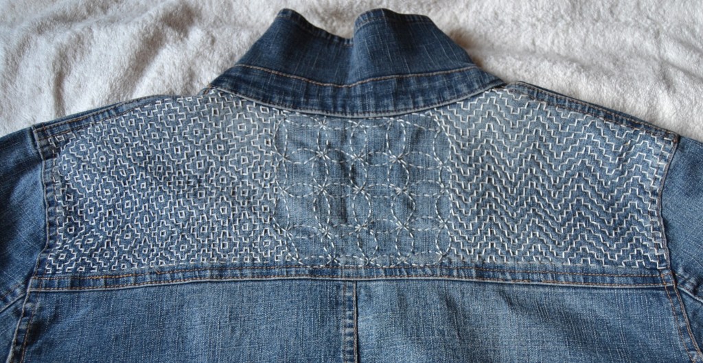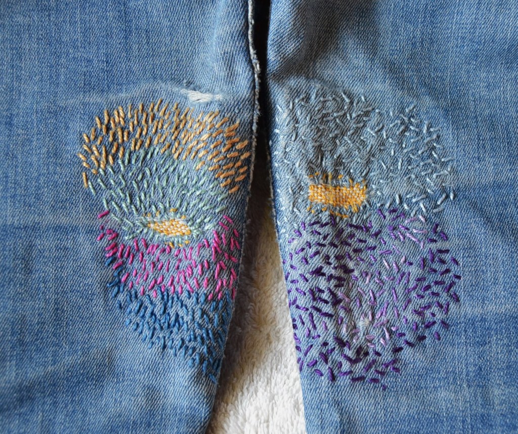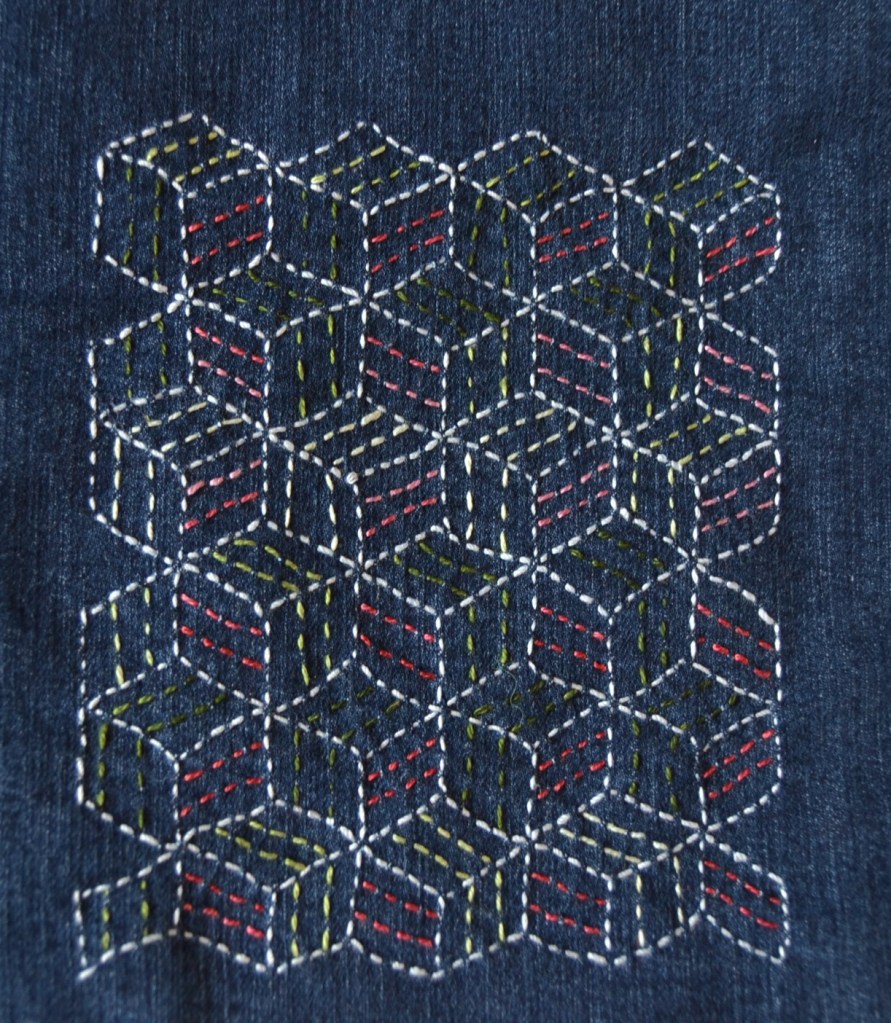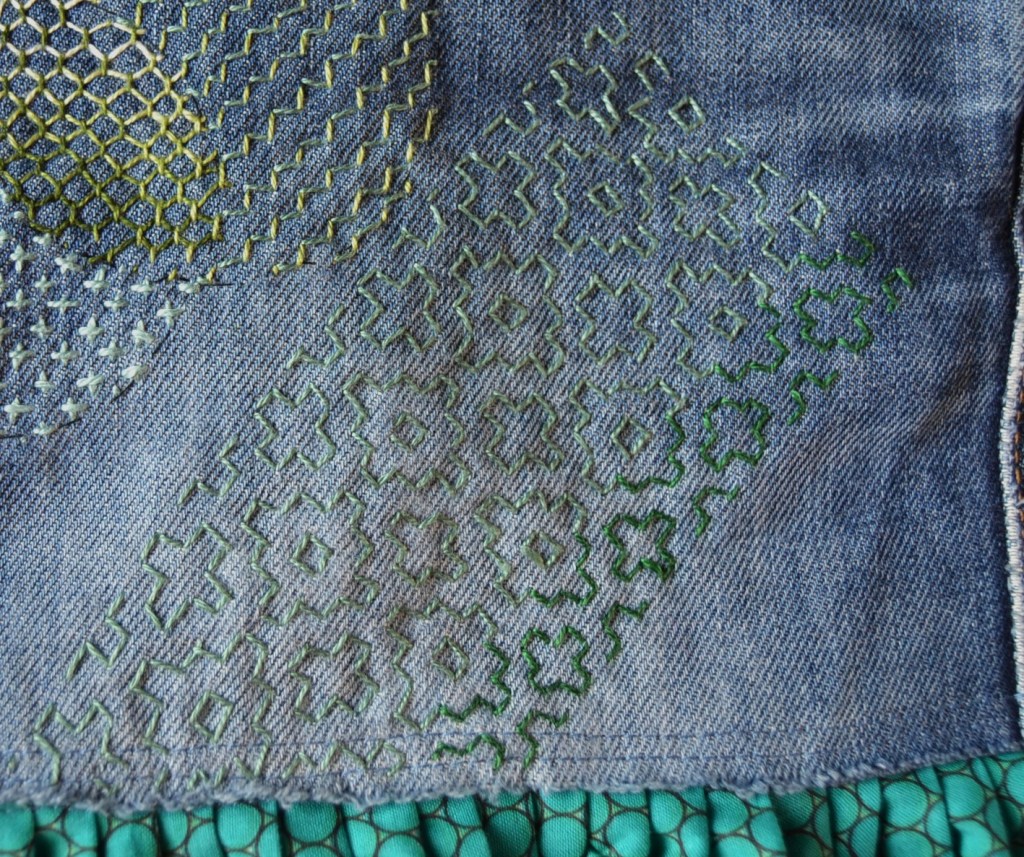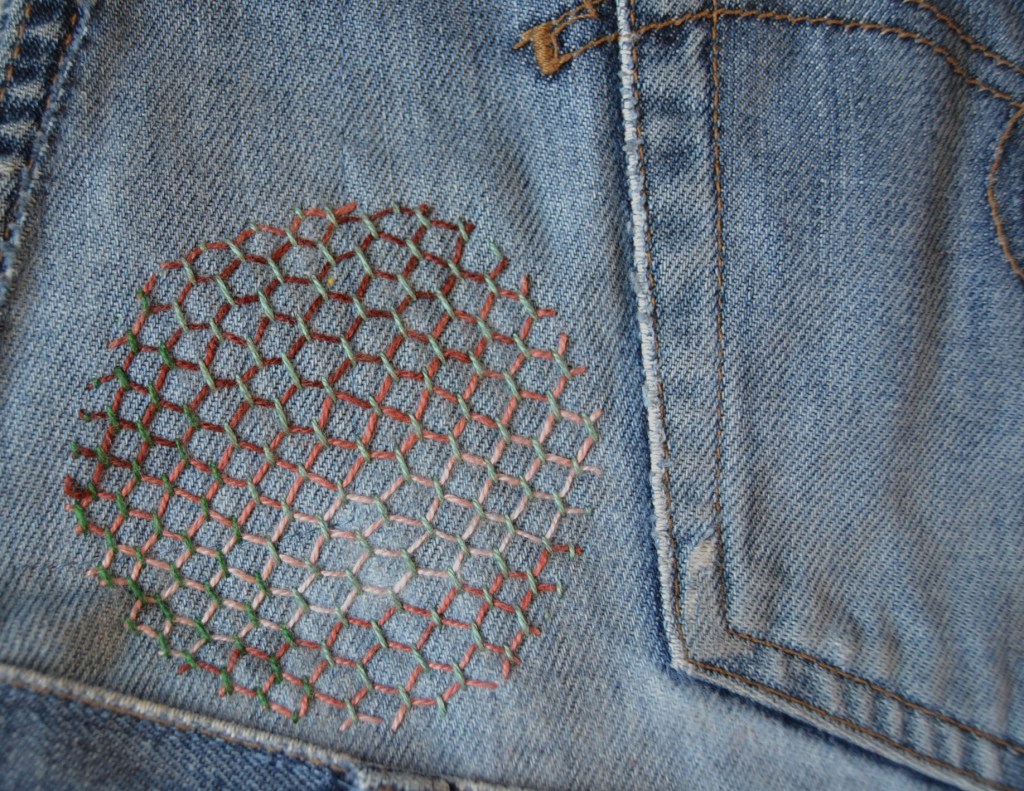Olen nyt aloittanut pistelyssäni uuden vaiheen käyttämällä erilaisia pistelyitä erilaisiin kuviomuotoihin. Toistaiseksi kuvioni ovat olleet pääosin ympyräitä tai vinoneliöitä, mutta kohta on työnalla farkkujen toiseen pakaraan sydämenmuotoon jotain Sashiko-kuviota.