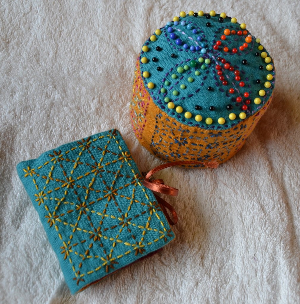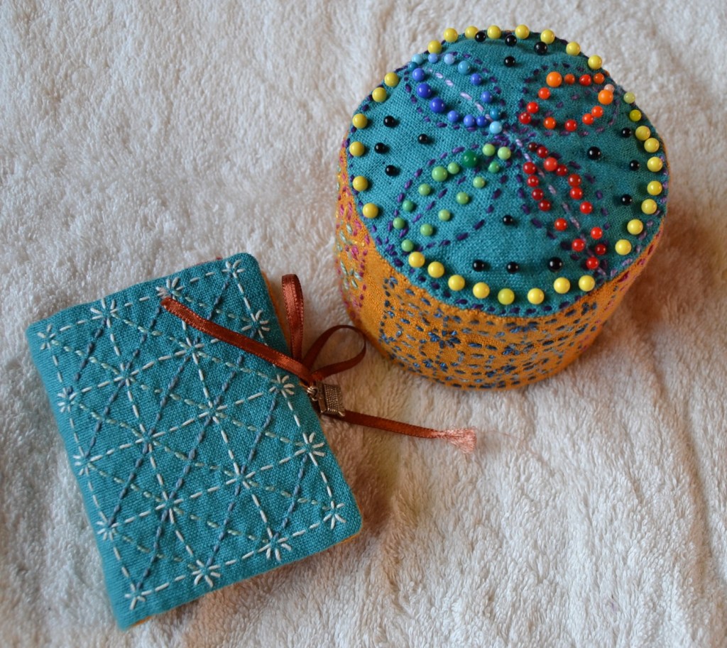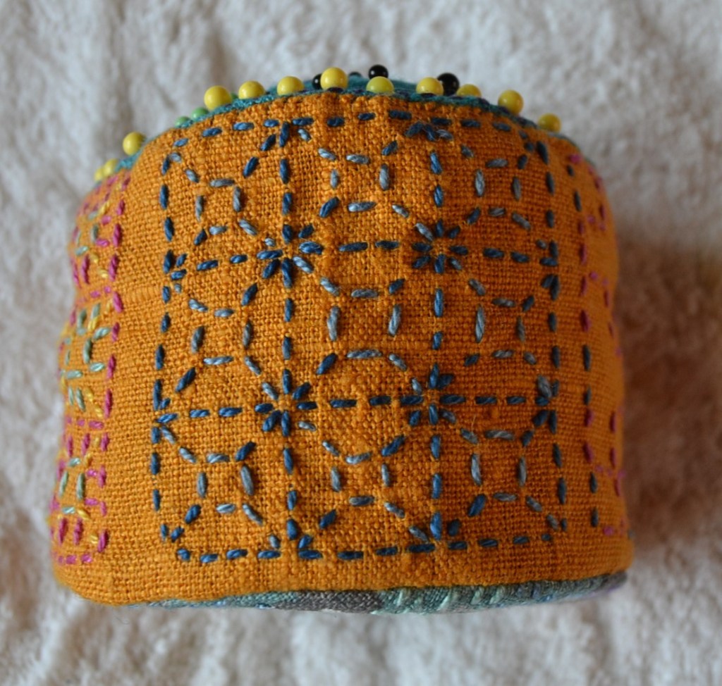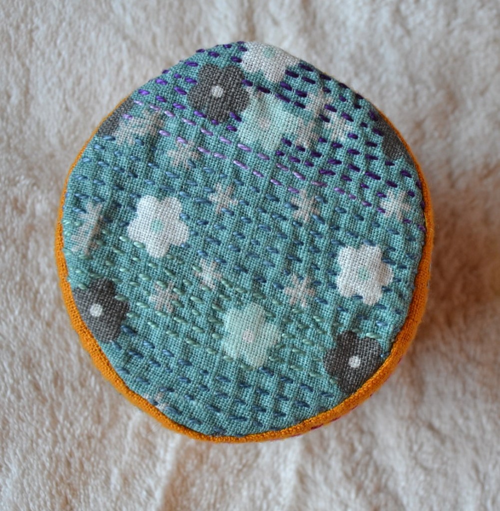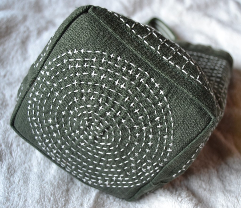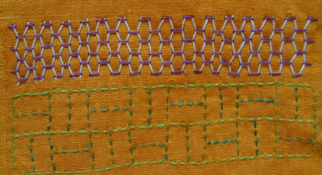 Erilaiset variaatiot Persimon Flower -kuvioista ovat tosi koukuttavia, kun niissä ensin vaan jaksaa pistellä yhteen suuntaan olevat pistot oikein. Tarkkana pitää olla vierekkäisten pistorivien keskinäisen rytmityksen kanssa. Näissä kuvioissa piston pituus on aina samanmittainen sekä oikealla että nurjalla puolella. Ja toiseen suuntaan pistellessä pistot sivuavat kulmista toisiaan. Kuvioissa syntyy eri kokoisia ruutukuvioita. Näitä kuvioita kiersin alkuun vähän kaukaa, mutta nyt ne ovat nousseet suosikeikseni.