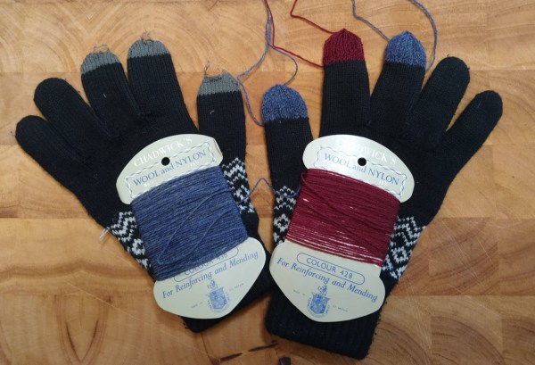 Käsineistä oli mennyt rikki kaikki kuusi sormenpäätä, joissa oli kosketusnäytöllä toimivaa materiaalia. Uudet parsinlangalla neulotut sormenpäät hajonneiden tilalle tekivät käsineistä kuin uudet. Korjaaminen kannattaa aina.